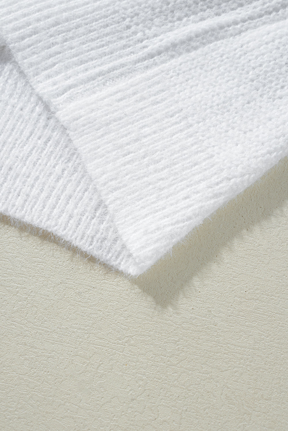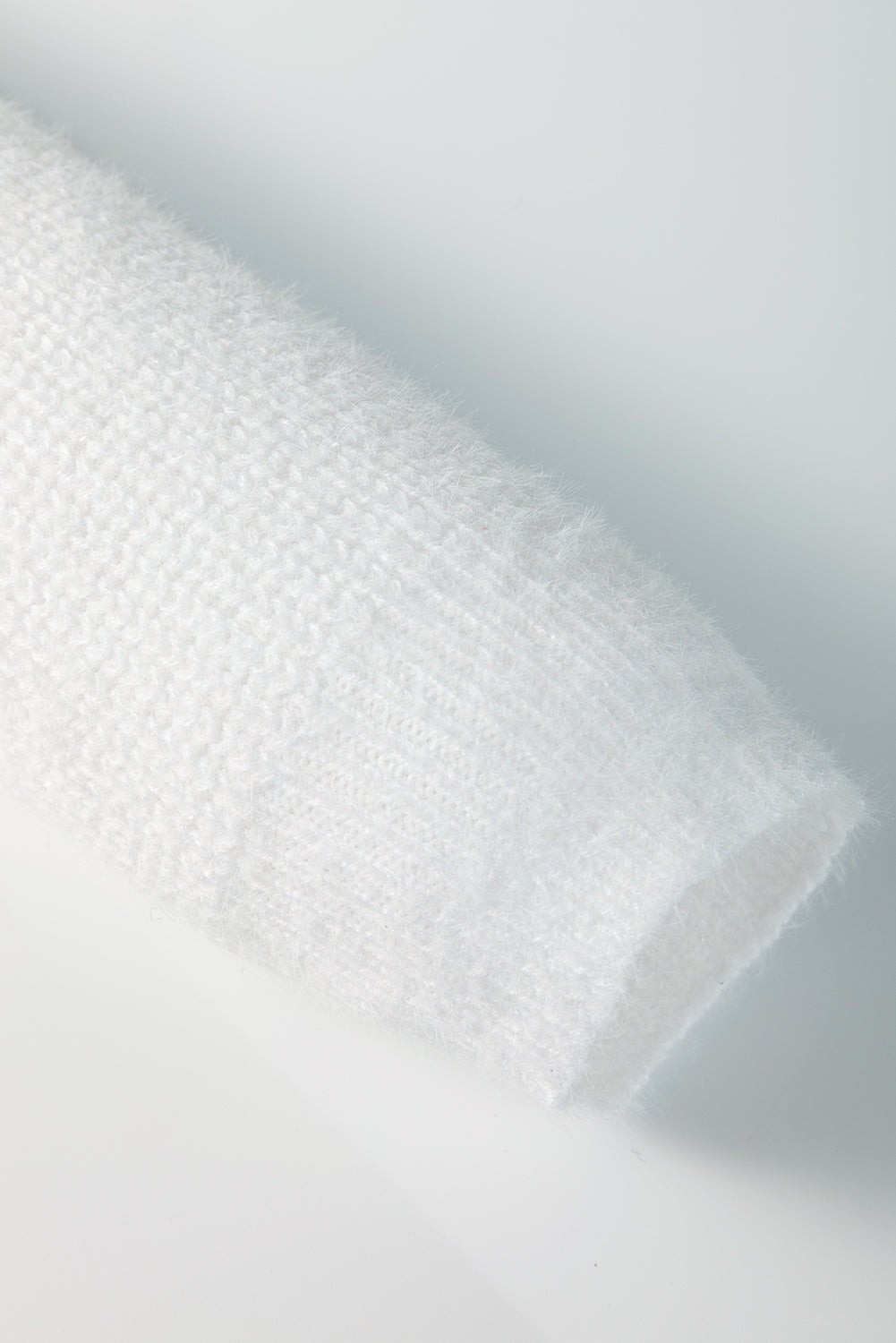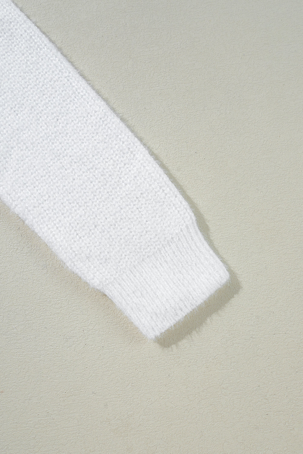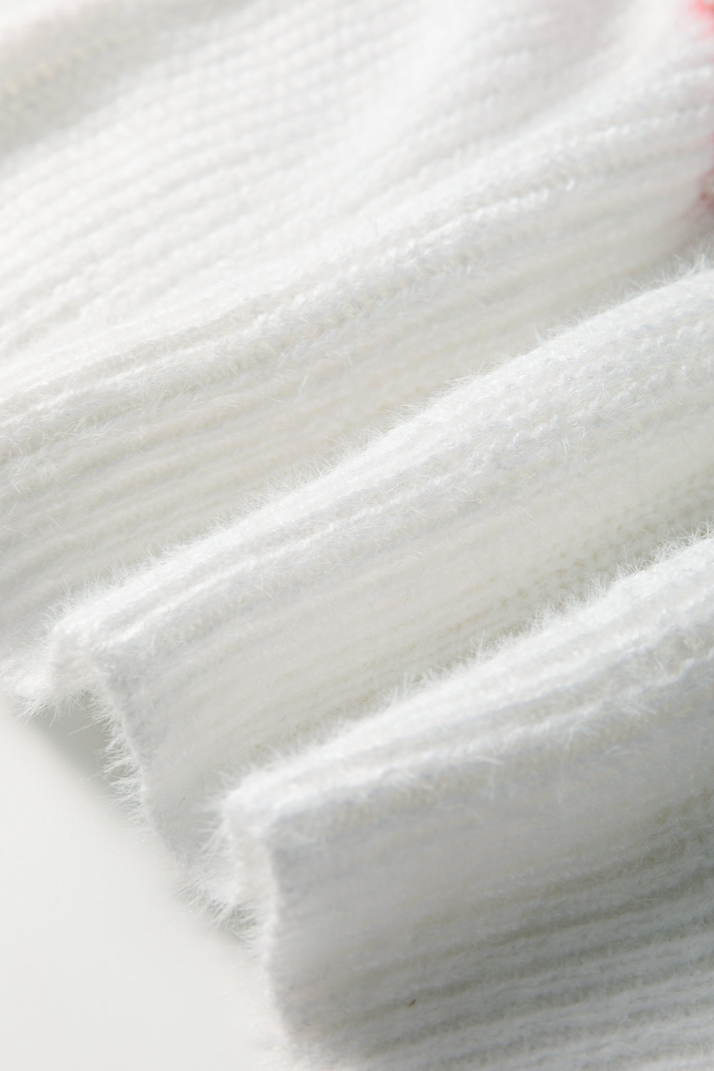 White Pearl Beaded Heart Pattern Fuzzy V Neck Sweater